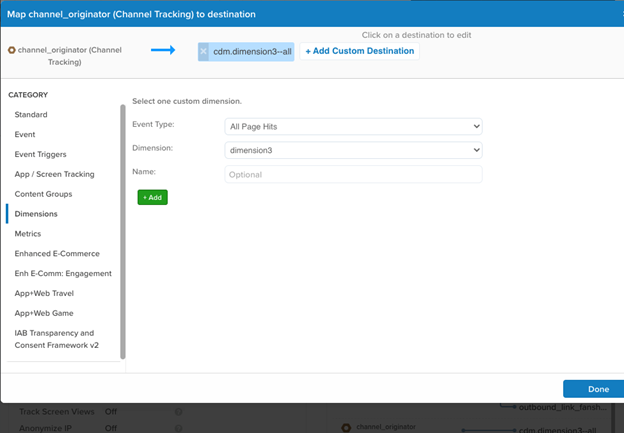 For a custom dimension, the category will be Dimensions. Within the dimension mapping screen, you will select an Event Type, Dimension, and an optional Name. For Dimension, pull the index from the Google Analytics admin. It should be a value from 1-20. Event Type for Channel and Category output variables will be “All Page Hits” as we will want this data collected on every page of the site. Since our client had Enhanced Ecommerce enabled within their Google Analytics account, we are able to leverage the “Purchase” Event Type for the Credit output variables. We only want to collect this data when a purchase is made on the site since we want actual purchase totals.