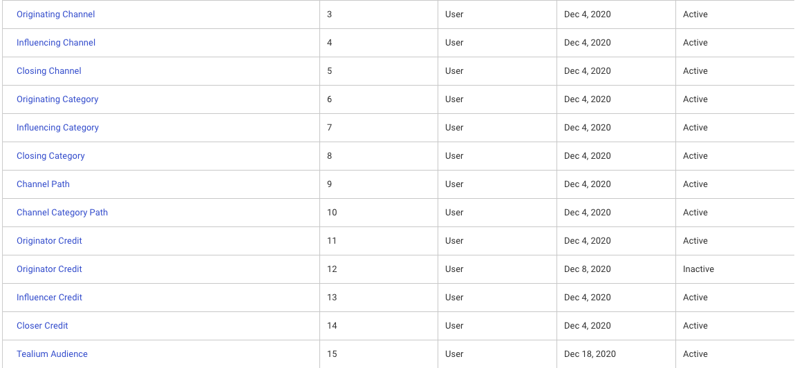 Moving into Google Analytics under your desired property, you can create custom dimensions for the output variables listed above. Ensure that these custom dimensions are User scoped and have the state listed as “active”. Note that you are only allowed 20 custom dimensions within a single property. There are 11 channel variables listed above. Depending on your needs, you can bring in as few or as many as you want. In our configuration, we opted for a one-to-one naming convention to keep things streamlined between platforms.
