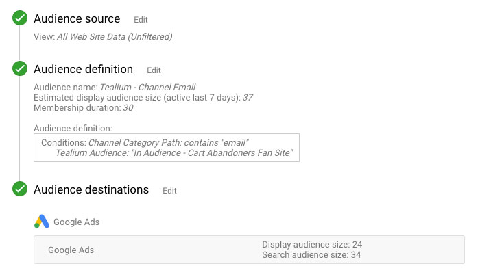 Please refer to the Tealium article listed in the beginning of this article for the general construction of the Google Analytics connector. For the event action and category naming convention, make it easily identifiable within the Google Analytics by providing some additional context around what this specific event represents. For instance, including the target audience along with the audience action like so: “Joined Audience Shop Cart Abandoner”.