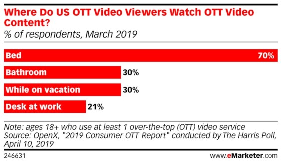 Sometimes called, “video everywhere,” or OTT (over-the-top, which simply means video that is distributed over broadband, instead of over the air or through cable), US adults are indeed watching the screens everywhere, but mostly in bed!
