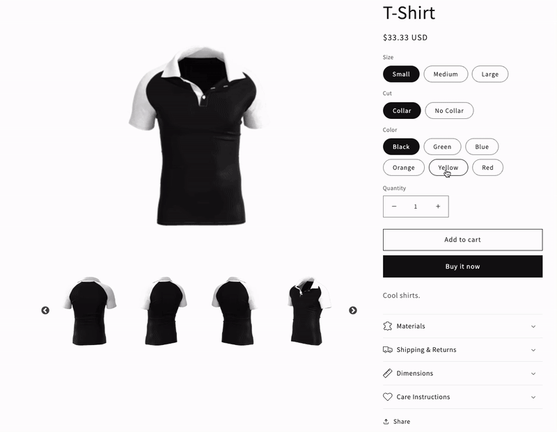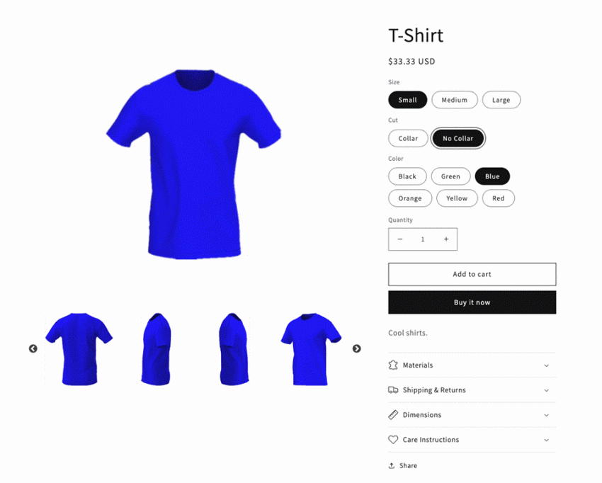 This tutorial strips everything back to Dawn’s bare bones to show the solution to our challenge (see figure below), in addition to a product add with variants, options and images. Please see this link if you don’t know how to add a product with variants and options.