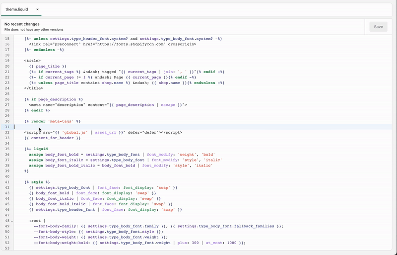 When ‘theme.liquid’ loads on the right side of your window scroll down to line 32.