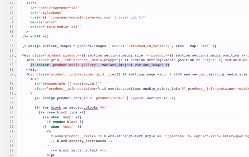 {% render ‘filename’ %} is the liquid tag we will use to output dynamic content into our template. We deleted the ‘variant_images: variant_images’ because we do not need to pass any variables through our render tag.