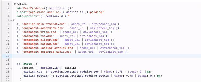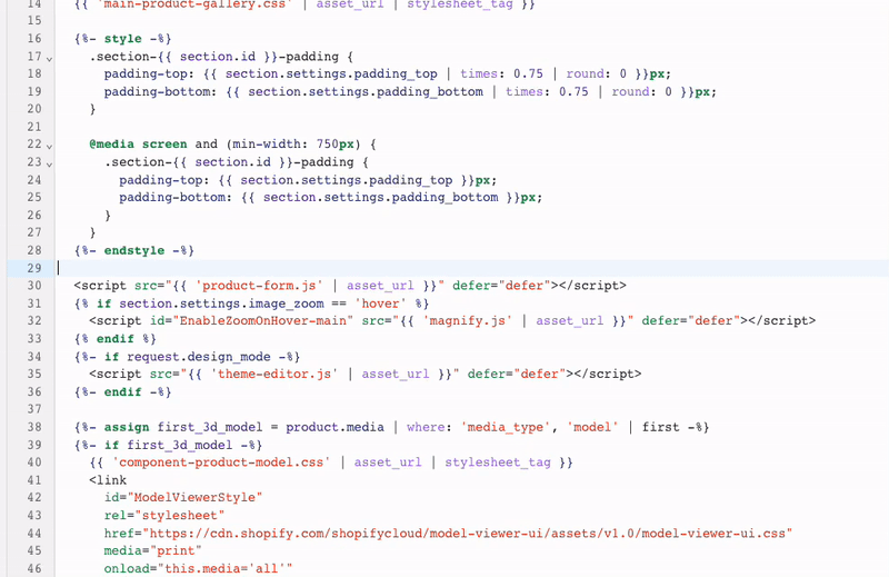 Back on the left side menu, located under the ‘Sections’ folder, find ‘main-product.liquid’ and open it. This is Dawn’s default product template for all products. We preemptively are adding our file and script paths and will create the corresponding files afterward.