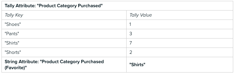 The Tally attribute is the most unique of all the data types offered by Tealium because it has a feature that none of the other attributes have called the “favorite”. When you create a new Tally attribute, a new “favorite” attribute is created and linked to the Tally automatically. This favorite will return the string value of the Tally with the most entries. A Tally is essentially a JSON store of key/value pairs where the key is the name of the affinity entry and the value is a number value associated to it. For all our sample use-cases in this post, you can think of the number value as a ranking system. Below is a grid representation of the type of information that can be contained inside a Tally.