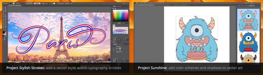 Project Sunshine is about adding colors and lights to vector artwork. With one click, it converts an imported hand-drawn illustration into a clean and precise vector outline. By clicking each inner shape or outline, you can assign individual colors to your illustration. You can also use the Sunshine color tool, and by selecting the entire drawing, Adobe Sensei will conjure up multiple color scheme options for you to choose from. Once you select a color arrangement to your liking, you can then adjust colors, since this is all vector, to refine your artwork to your complete satisfaction. Adobe Sensei will also group sections of your composition that go together and assign harmonious colors to those groupings. Project Sunshine also allows you to add global shading and highlights to your vector artwork.