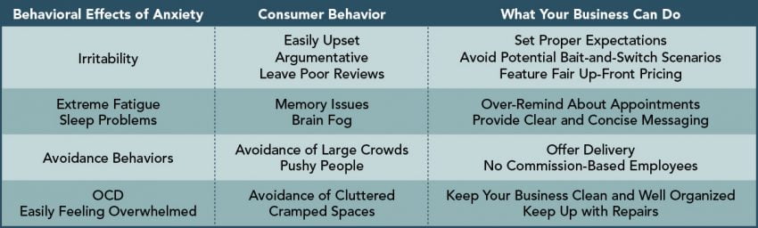 Research has shown that a low tolerance for uncertainty, or a low risk tolerance, is a major contributor to anxiety. This is a good barometer to brainstorm ideas for marketing to potentially anxious customers. What can your business do to reduce or eliminate uncertainty throughout the buyer’s journey?