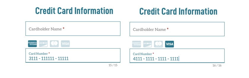 When possible, reduce the number of fields within the form. For example, don’t have the user select which credit card they will be using for the transaction; instead only require them to input their card number (as shown below). You can determine the credit card type from the card number. The same applies to zip code to determine city and state.