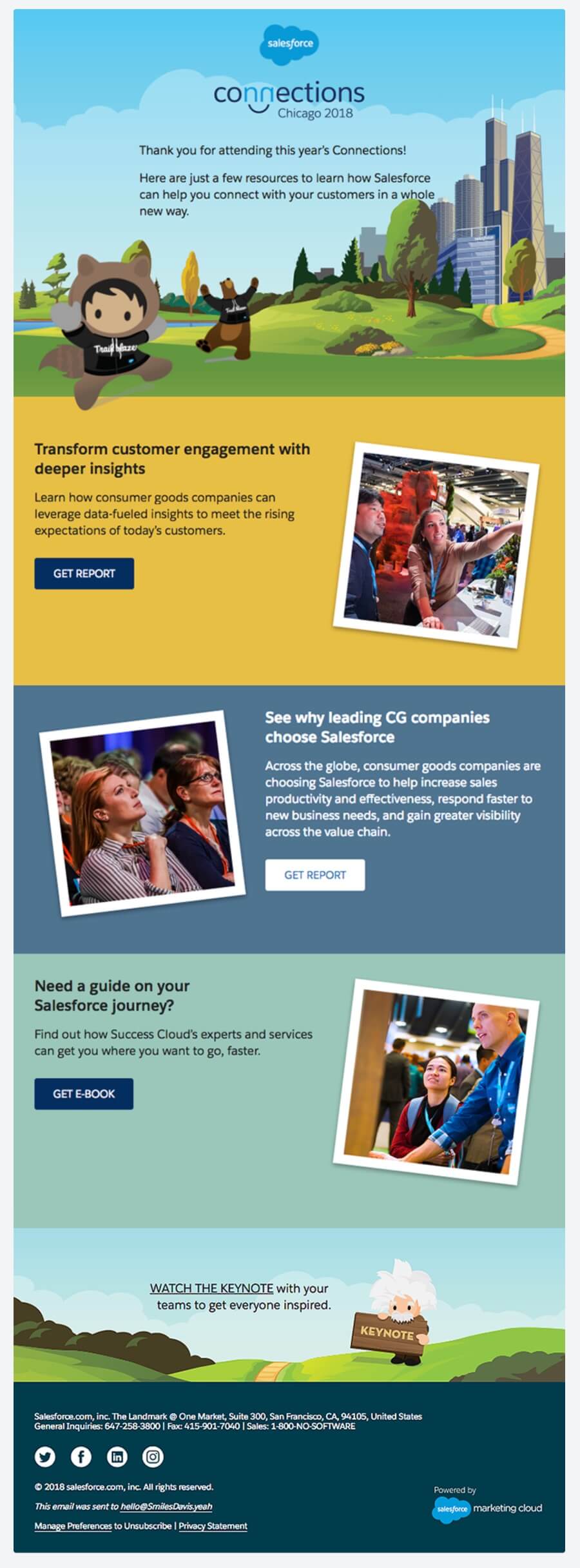 Our next example of the commitment and consistency principle is from Salesforce. In a strategic email campaign, Salesforce underscores its dedication to helping users establish and maintain meaningful connections with their customers. This initiative takes the form of a well-crafted email, brimming with an array of valuable resources, including insightful reports and enriching e-books. These resources are thoughtfully offered to recipients for download following their participation in a Salesforce field marketing event.