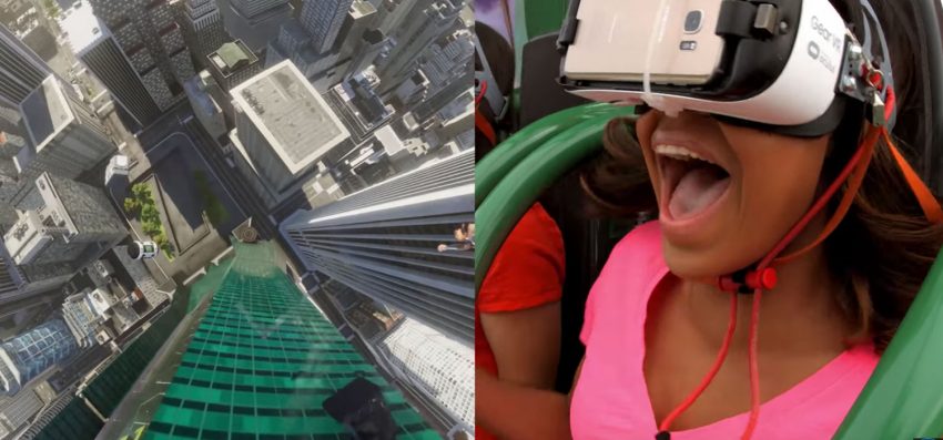 I recently “rode” a virtual reality ride at Main Event, a family entertainment center, where I sat in a stationary seat and rode a virtual roller coaster. It was in 4D, so the seats shook and vibrated, and there was a wind effect that started as I went down a hill on the coaster. It’s intense and basically all virtual (other than the 4D effects), which made it feel like I was actually on a roller coaster. A different type of virtual reality roller coaster ride is one that they have at Magic Mountain, where you ride an actual roller coaster but wear goggles during the ride, so you’re surrounded by a different reality that could be anything! The animation below is a side by side of the virtual reality “game” going on inside the goggles, on an actual roller coaster rider.